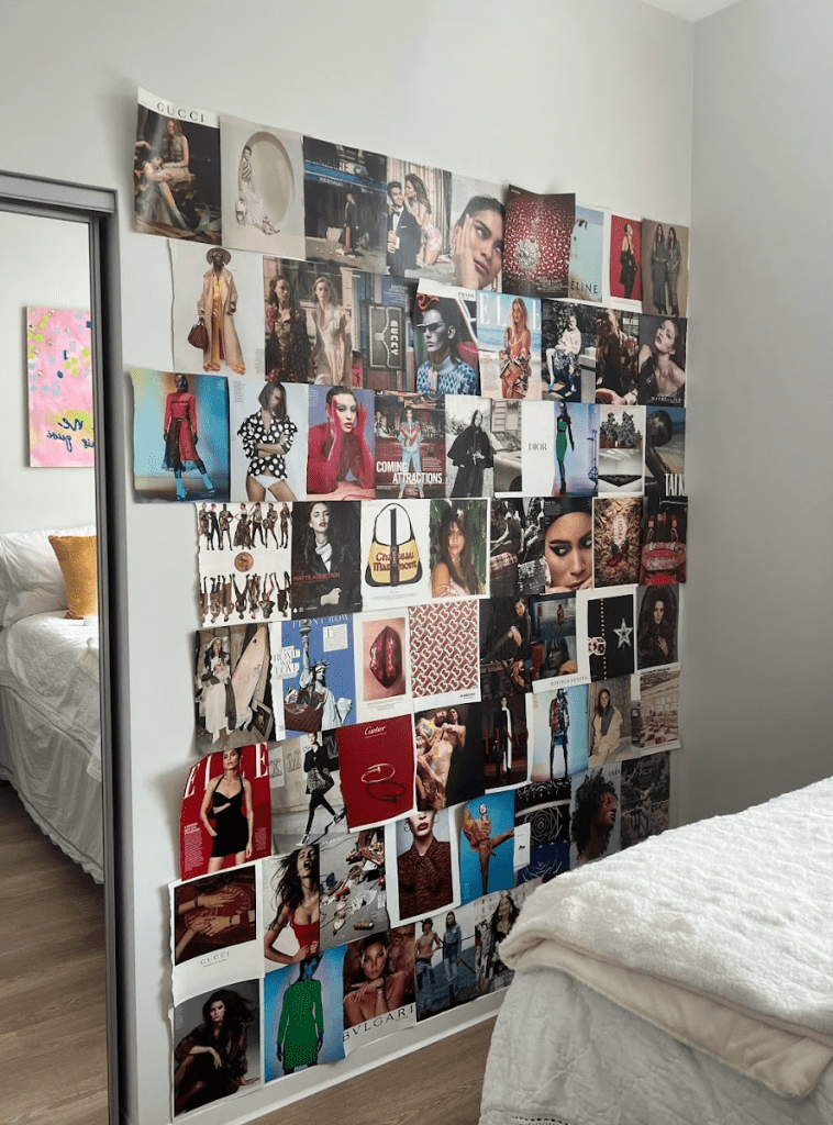 Aside from being a great decorative piece, I also love magazine walls for how well of a tool they are for visualization. Looking at the wall the first thing before going to bed and after waking up re-orients my mind for what I want my future to be like regardless of how my present circumstances look. Especially when school work gets tough, looking over at the wall provides me with inspiration to push through and work to get closer to my dreams.