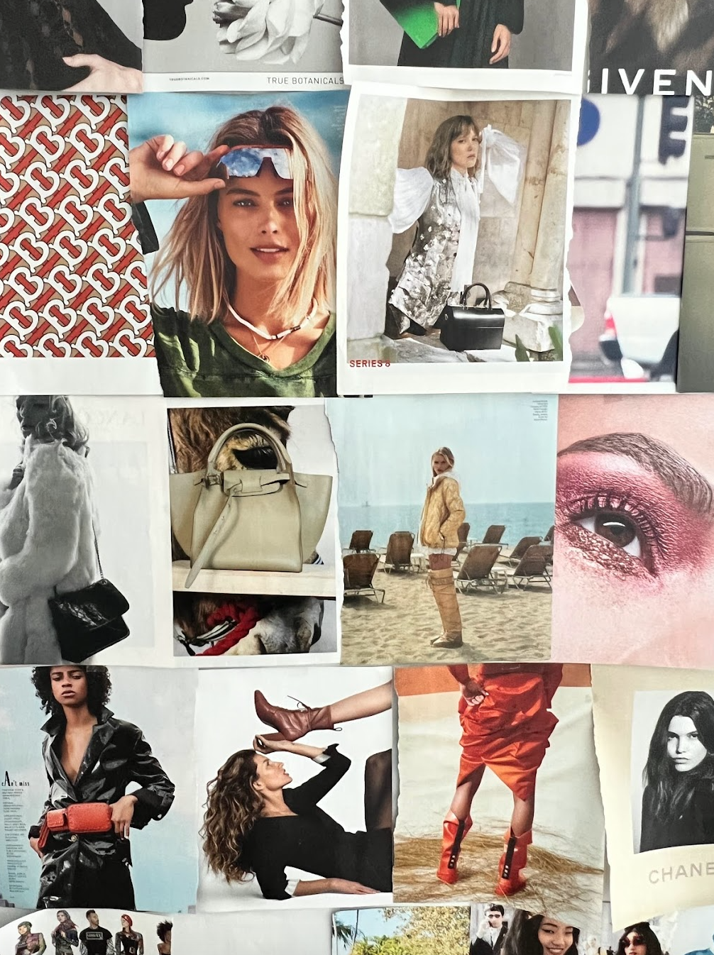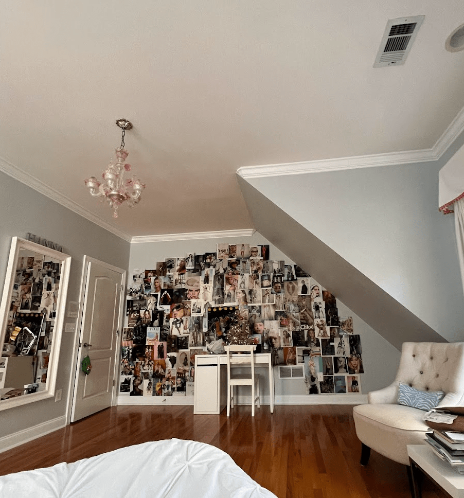 1. Come up with a layout theme and stick with it. I find that whenever I make a magazine wall I tend to attach a specific overarching ‘vibe’ to it so that it’s easier to weed out photo options that are a good but not necessarily a great fit. In the first magazine wall I made for my apartment room, I wanted it to look very “girly” with a high-fashion twist, hence all of the brand advertisements and pinks that can be found throughout. Another tactic I like to use is literally coming up with how I want to lay the photos out. In the one I made for my childhood bedroom I took a more organic approach by having the photos emanate from the center, whereas the two I’ve made in my apartment have been arranged in rows so it has more structure. All in all, having a purpose steers the magazine wall in a specific but not unyielding direction that helps to eventually add cohesion by adding clarity to what images are necessary.