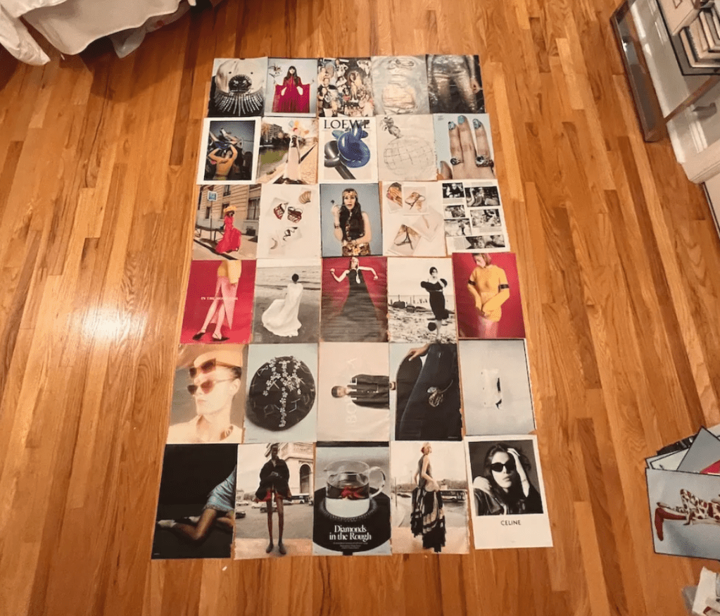 2. Spread out your favorite pages. Chances are your absolute favorite images that you’ve selected come from either the same multi-page editorials or ad campaigns from the same brand. To promote flow among the images, I like to shuffle them depending on the amount of structure I plan on arranging them on the wall. For example, to add variety to the images I pulled for my childhood bedroom, I randomly shuffled them since I went for a more organic layout. For my apartment, I’ve developed the strategy of having one bold accent color per row that can be skipped and re-incorporated between rows. This has also enabled overall coherence with the whole wall even if the rows don’t seem like they serve a larger purpose individually.