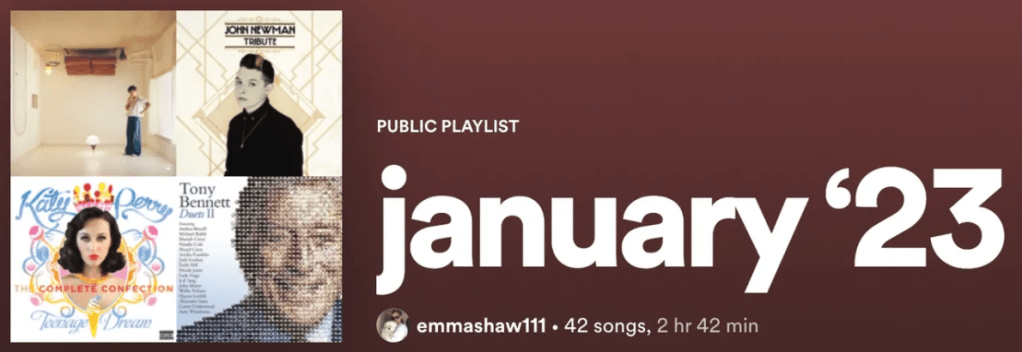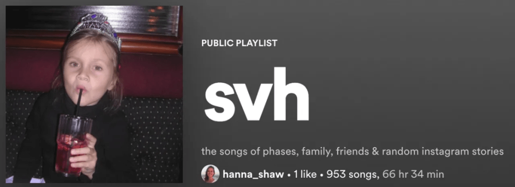 This playlist has been in the works since my sophomore year of high school, so it’s been around the block quite a few times. I started it to serve as a physical archive of all of the music suggestions I would receive from family and friends, as well as the screenshots of songs that random people I follow on Instagram would post to their stories unprompted. Although I used to be a lot better at updating it, svh has now almost amassed 1,000 songs. This is the type of playlist I like to pull out when studying or doing work because the songs aren’t ones that I would listen to on a regular basis (otherwise cue the lipsyncing) but that still have pleasant memories attached to them to keep me motivated.