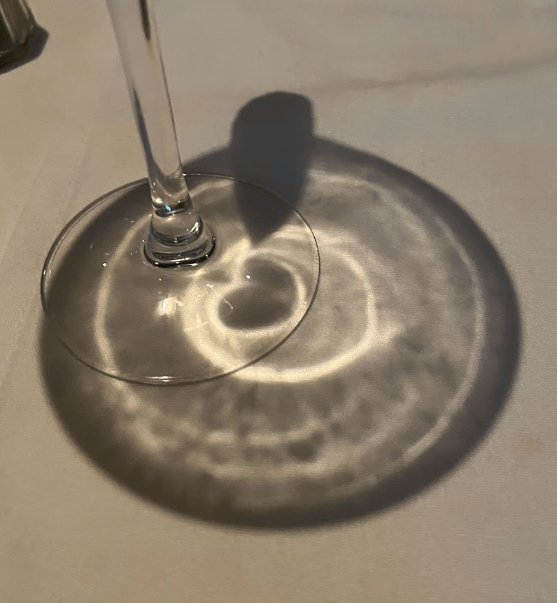 A practice I’ve started conducting in my life to reinforce how love is around us all the time is looking for hearts in everyday objects. Since I started doing this, they’ve taken the form of leaves, strands of hair in the shower drain, and most recently, the reflection from my martini glass when I got dinner with my grandparents this past week.
