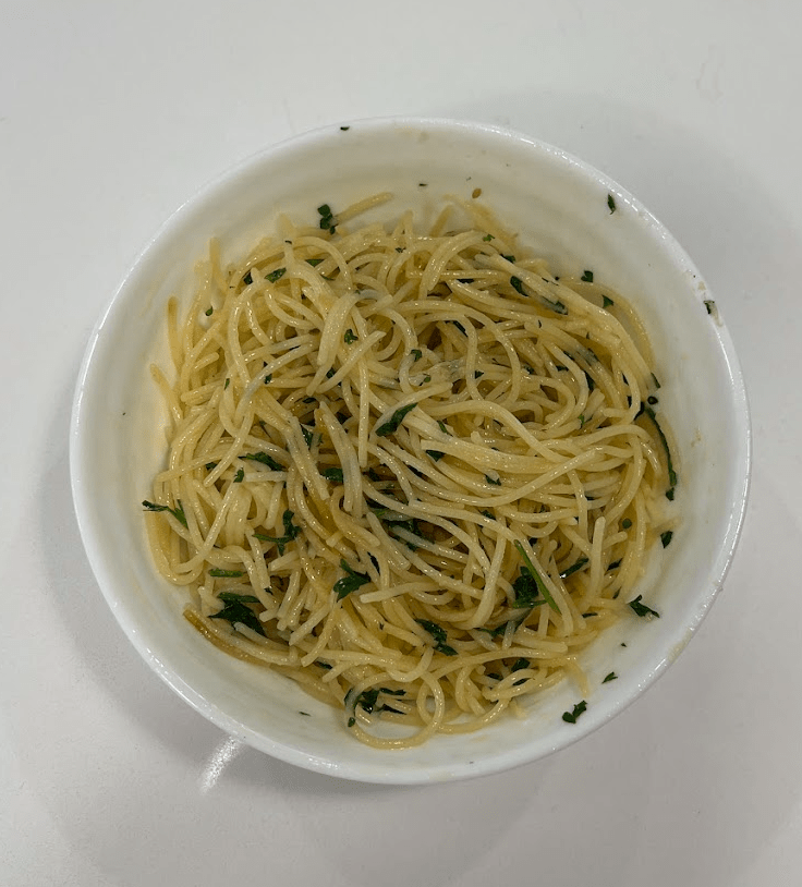 Not the prettiest picture, but it turned out delicious and was very simple to make. All you do is saute some garlic in a pan while simultaneously cooking your pasta until almost al dente, then add in parsley and some sort of chili (I used chili crunch but you can use flakes or Calabrian chili paste) to the garlic, transfer the pasta over to the pan with garlic, combine with some reserved pasta water to make a sauce, top with a squeeze of lemon, and BOOM. I had this for days and didn’t get tired of it.