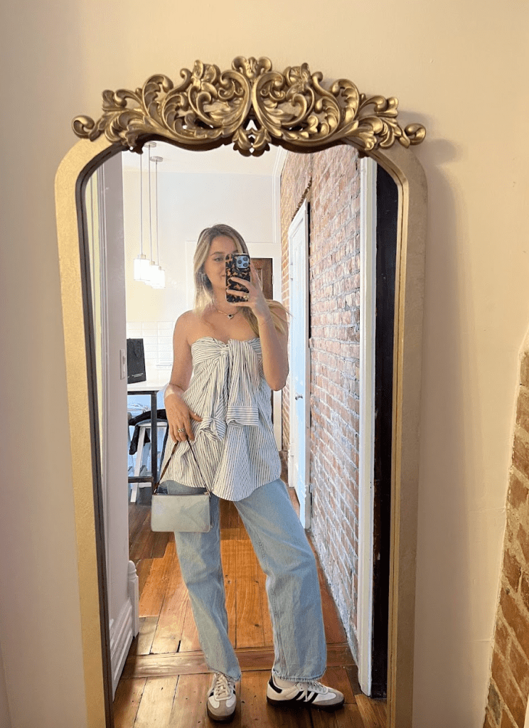 After spending the majority of my Saturday morning working at a café in German Village and walking around the neighborhood, I got ready to go to Italian Fest and watch the OSU game at a bar with my friends. Naturally, I had to wear blue to represent Georgia Tech who beat UNC by a touchdown. I tied a striped blue button-down as a halter top, threw on sneakers and a pair of baggy jeans, and called it a day.
