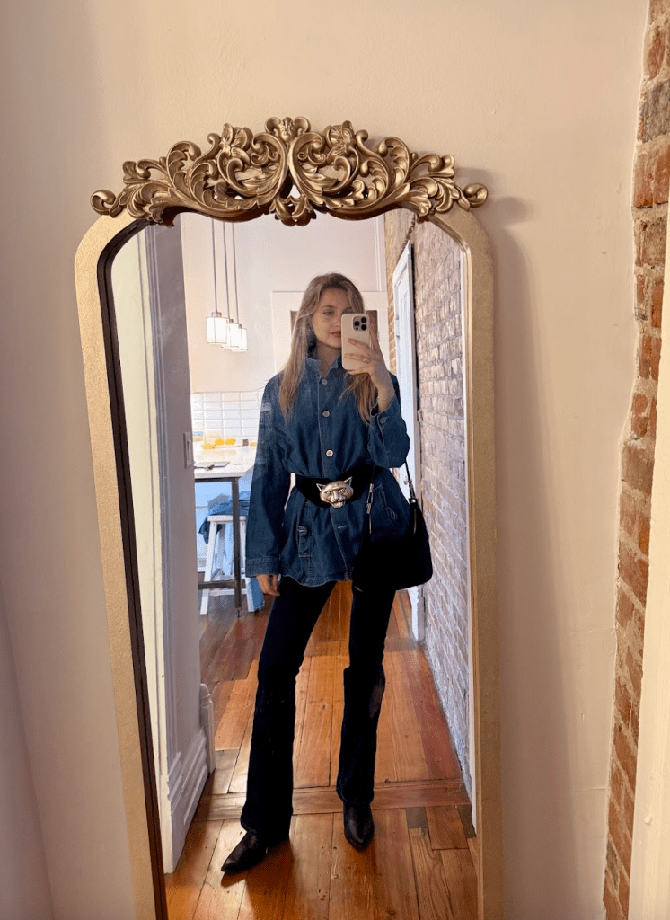 another favorite one of mine from this past spring was a fresh take on a Canadian tuxedo. i paired a denim tunic i got while thrifting with Abercrombie’s bootcut jeans, a pair of cowboy boots, and my grandma’s jaguar belt.