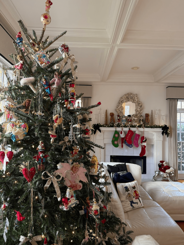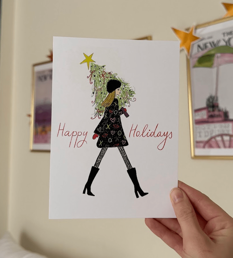 my incredibly talented and artistic sister Emma designed a hand-drawn Christmas card for me to send out to all my loved ones. we made a cartoon version of me wearing my Mimi’s coat and carrying a bow-adorned Christmas tree as the focal point.