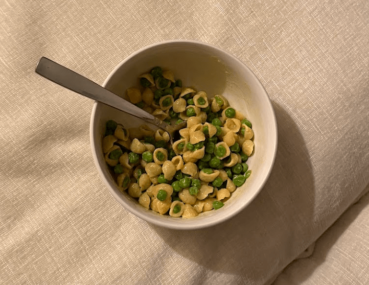- reserve about 1/4 a cup of the pasta / pea water before straining the pasta